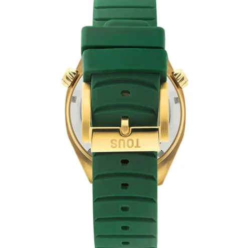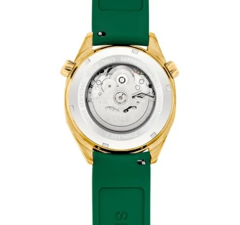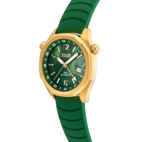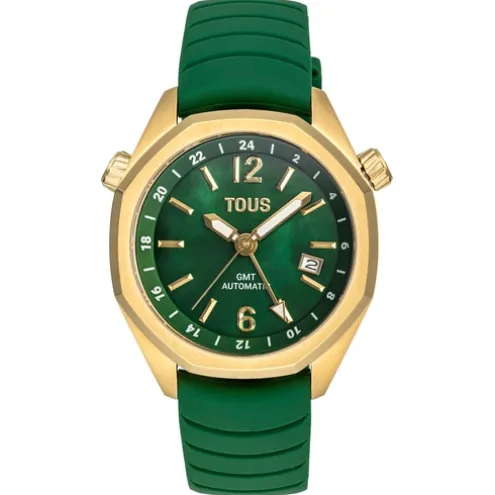 Zegarek gmt automatyczny TOUS Now ze stali nierdzewnej, z zielonym silikonowym paskiem. Tarcza z zielonej masy perłowej, z płaskim, okrągłym szafirem u dołu koperty. Szkiełko: okrągłe, płaskie, szafirowe. Średnica: 42 mm. Wewnętrzna ramka skalibrowana co 24 godziny, obracana za pomocą lewej koronki. Funkcje: godziny, minuty, sekundy, wskazówka 24-godzinna GMT (druga strefa czasowa) i kalendarz. Wodoodporny do 10 ATM. Autonomia: 41 godzin. Kaliber: TIME MODULE NH34. Częstotliwość: 21600 na godzinę. Japoński automatyczny mechanizm mechaniczny GMT. Zapięcie na klamrę.