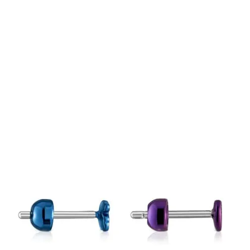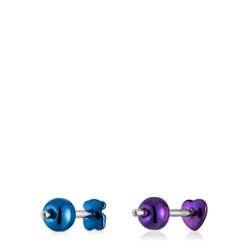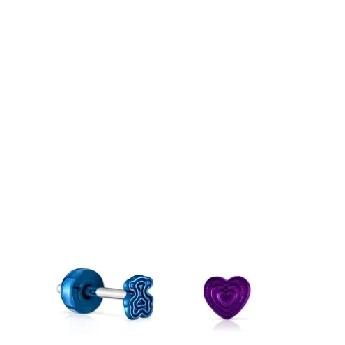 Zestaw dwóch pierciengów do ucha TOUS Bickie z charmsem w kształcie serca z fioletowej stali IP i charmsem w kształcie misia z niebieskiej stali IP. Rozmiar charmsa: 4 mm. Długość sztyftu: 10 mm. Grubość sztyftu: 1,3 mm. Wkręt.